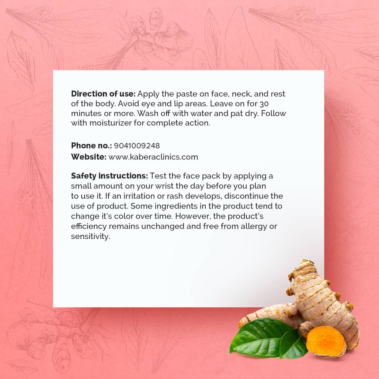 The Turmeric (Haldi) and Multani Mitti (Fullers Earth) face pack lightens up your skin and reduces aging by keeping the skin moisturized. This face mask makes skin healthier and softer by retaining its glow.
